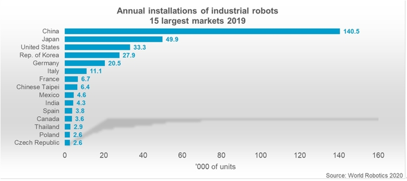 (年度工业机器人安装量排名前15位的国家©World Robotics2020 Report)
