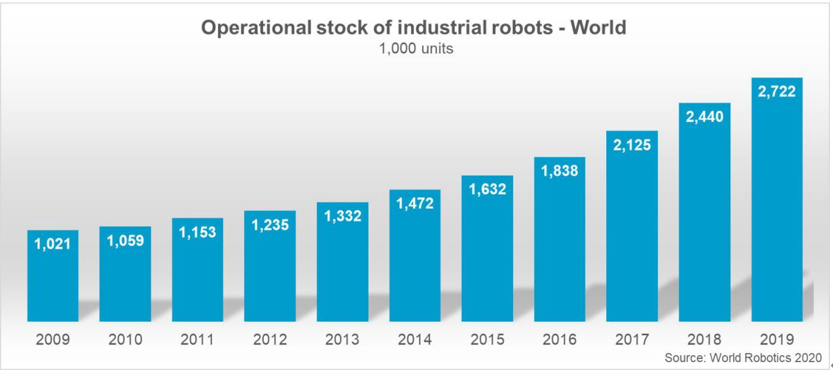 近日,IFR最新的《2020年世界机器人技术》—工业机器人报告显示,在世界各地的工厂中正在运行的工业机器人超过270万台,增长了12%,创下新的纪录。